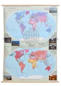Dwudzielna, szkolna mapa ścienna w skali 1:37 000 000 syntetycznie przedstawiająca kluczowe zagadnienia z zakresu zróżnicowania gospodarczego i społecznego świata.