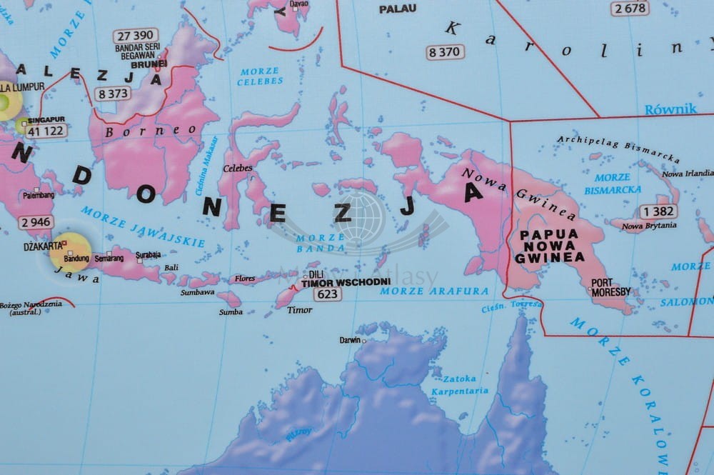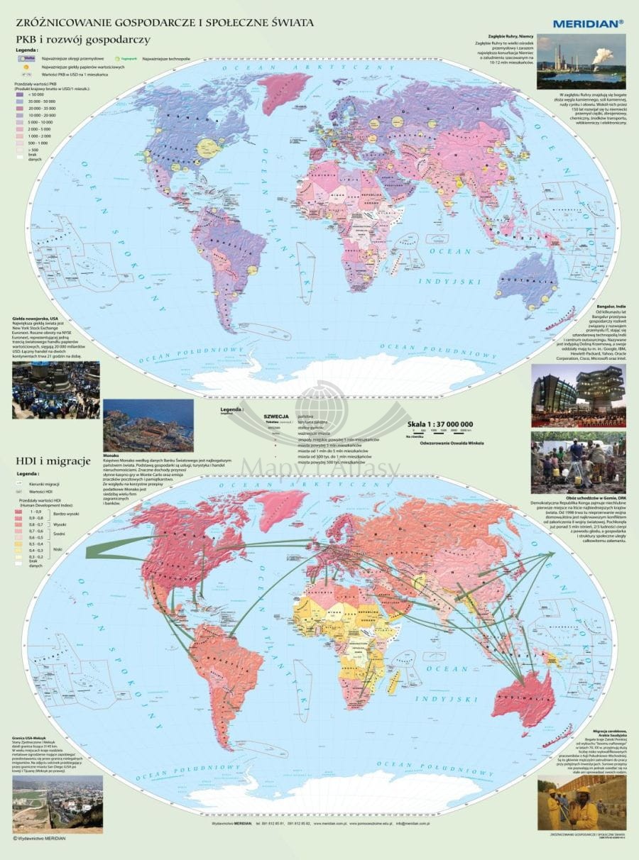 Dwudzielna, szkolna mapa ścienna w skali 1:37 000 000 syntetycznie przedstawiająca kluczowe zagadnienia z zakresu zróżnicowania gospodarczego i społecznego świata...