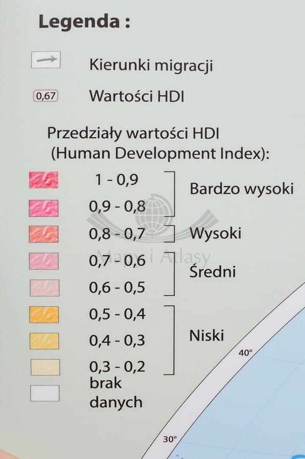 Druga część przedstawia zróżnicowanie społeczne świata według wskaźnika HDI. Na tle kartogramu umieszczone są dodatkowo szczegółowe wartości HDI dla każdego państwa oraz główne kierunki migracji.