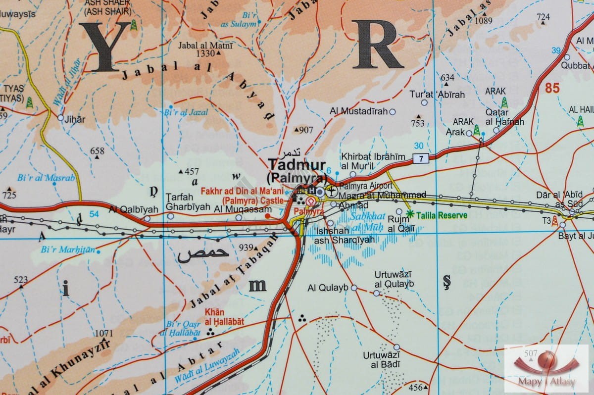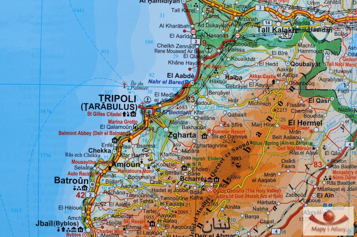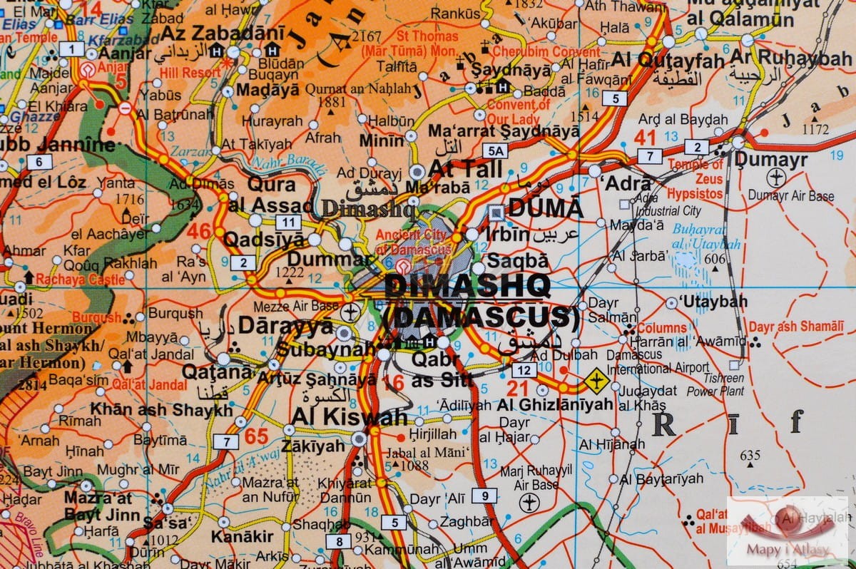 Drogowo-fizyczna mapa ścienna Syrii i Libanu w skali 1:750 000 wydawnictwa Gizi Map. Na mapie zaznaczono min.: