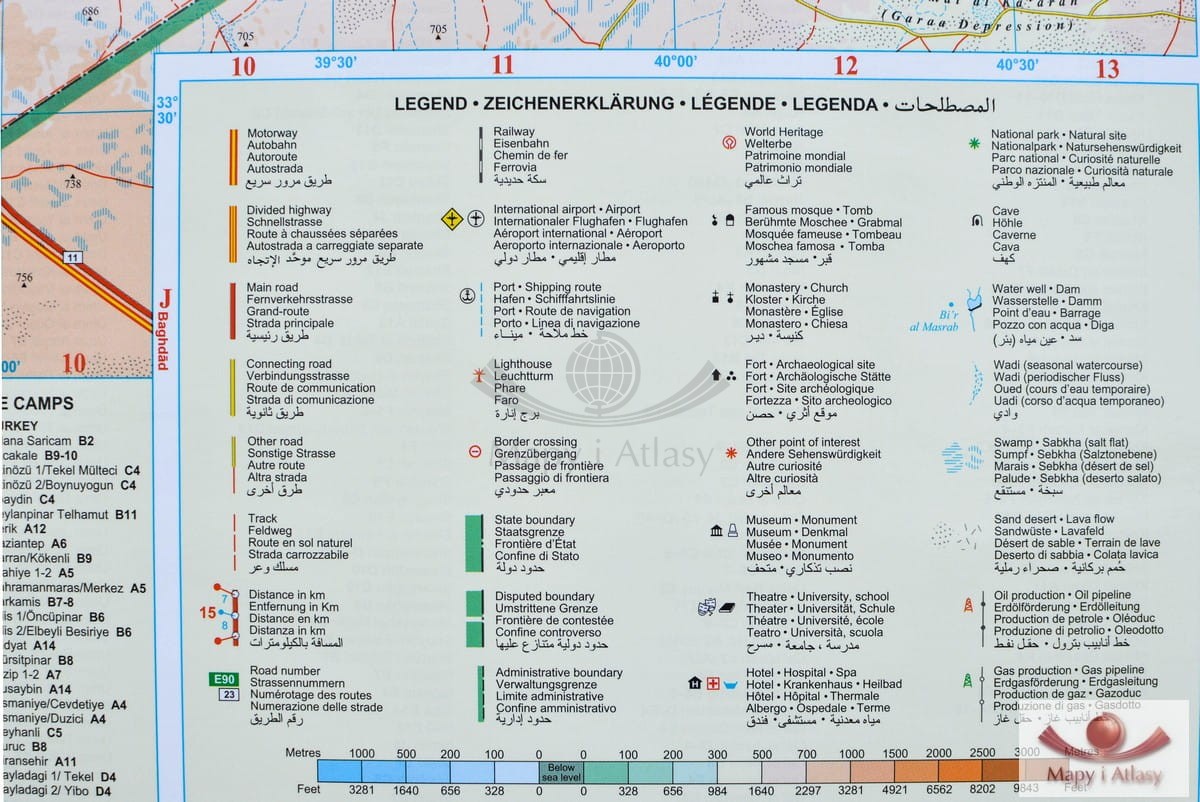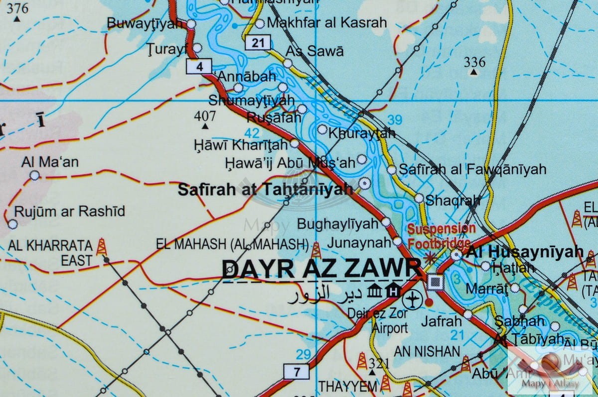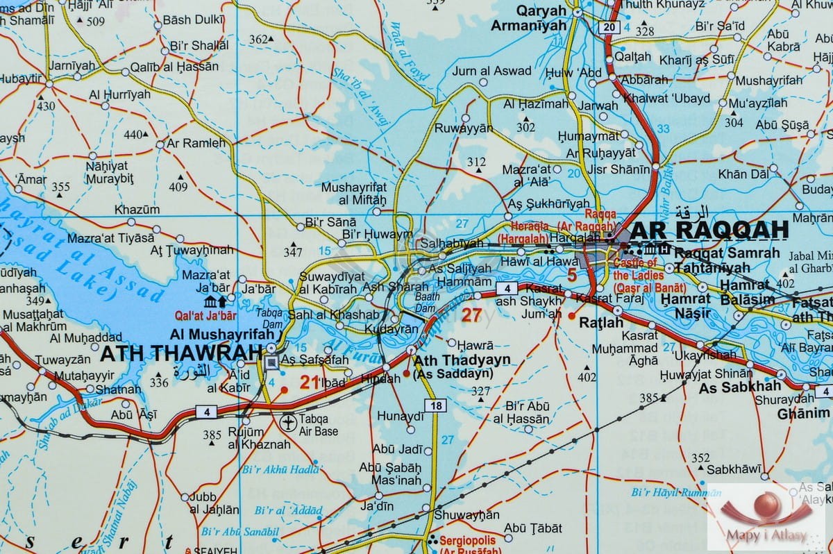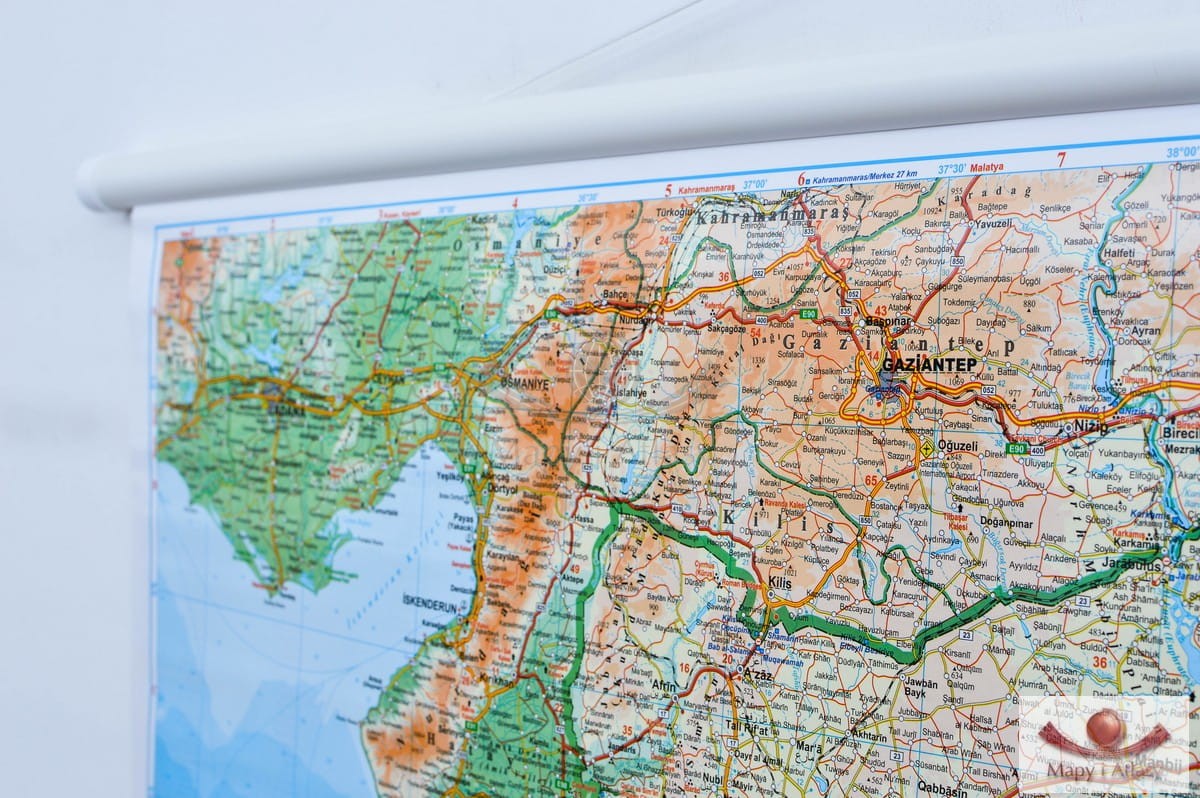Drogowo-fizyczna mapa ścienna Syrii i Libanu w skali 1:750 000 wydawnictwa Gizi Map. Na mapie zaznaczono min.: