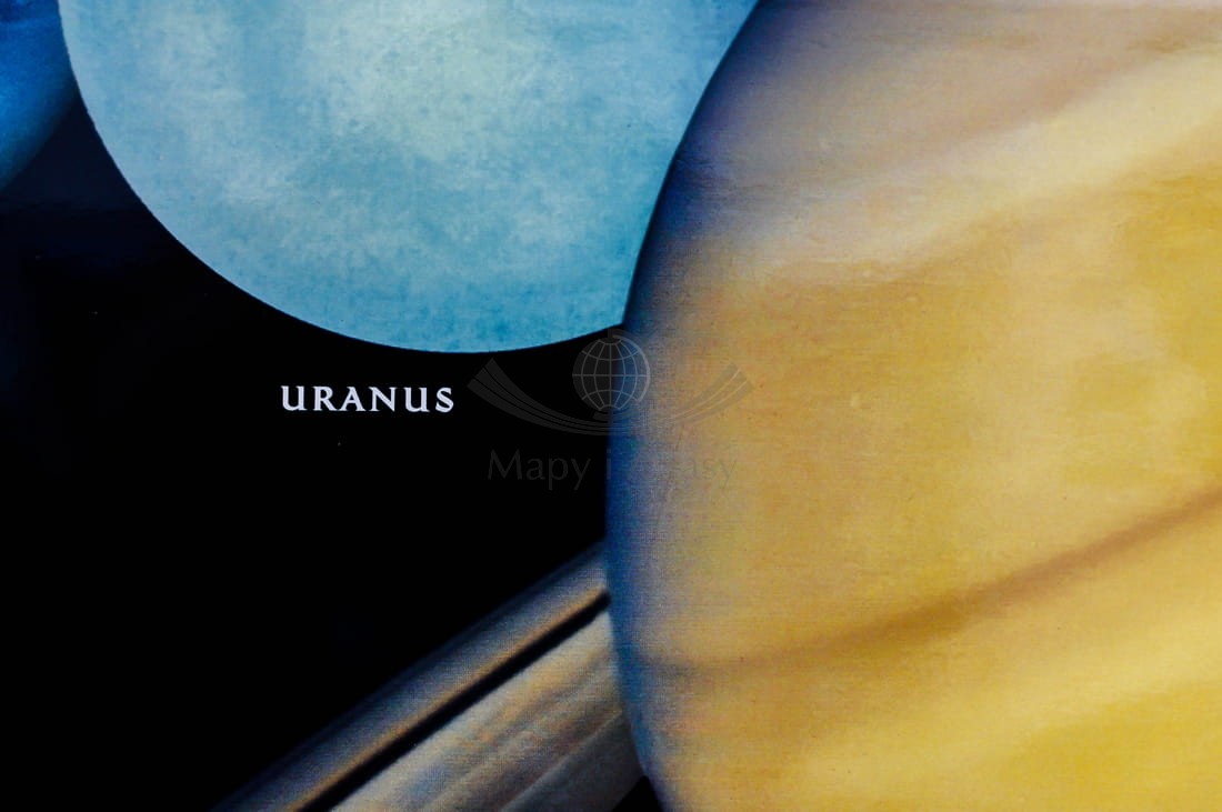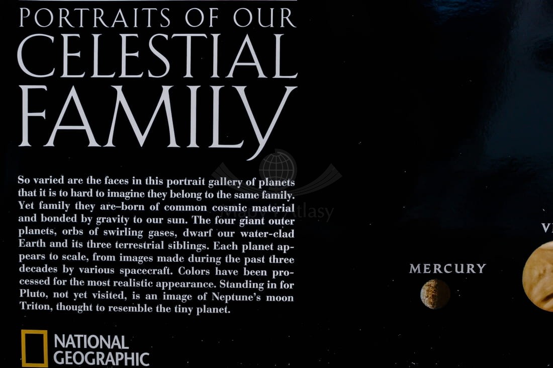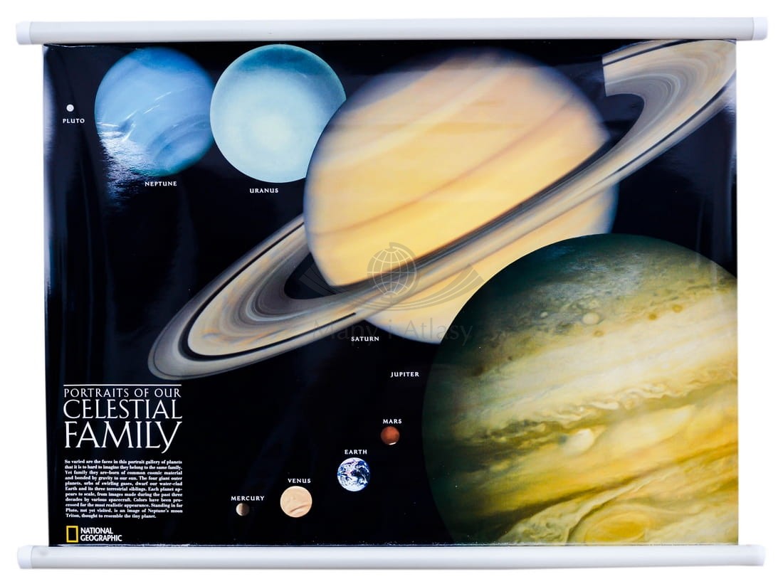 Dwustronna mapa ścienna Układu Słonecznego wydawnictwa National Geographic. Mapa w języku angielskim. Na pierwszej stronie przedstawiono planety skalowane do względnego rozmiaru - zdjęcia wykonano z różnych statków kosmicznych. Na drugiej stronie umieszczono informacje o Słońcu, planetach, ich satelitach, powstawaniu Układu Słonecznego i składzie ciał niebieskich.