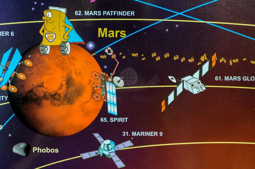 Mapa ścienna dla dzieci ilustrująca budowę Układu Słonecznego. Zawiera krótki opis historii eksploracji Kosmosu zilustrowany dodatkowo obrazkami.