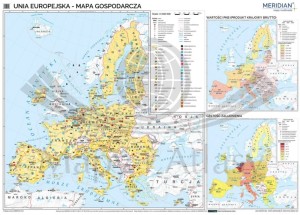 Szkolna mapa ścienna w skali 1:4 000 000 przedstawiająca najważniejsze zagadnienia z gospodarki krajów tworzących Unię Europejską. Mapa zawiera kompleksowe informacje na temat wydobycia surowców, dominujących upraw w rolnictwie, głównych gałęzi przemysłu i energetyki krajów unijnych.
