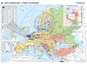 Szkolna mapa ścienna w skali 1:3 200 000 przedstawiająca najbardziej aktualny stan Unii Europejskiej oraz strefy Schengen, uwzględniając wyjście Wielkiej Brytanii ze struktur unijnych, czyli Brexit.