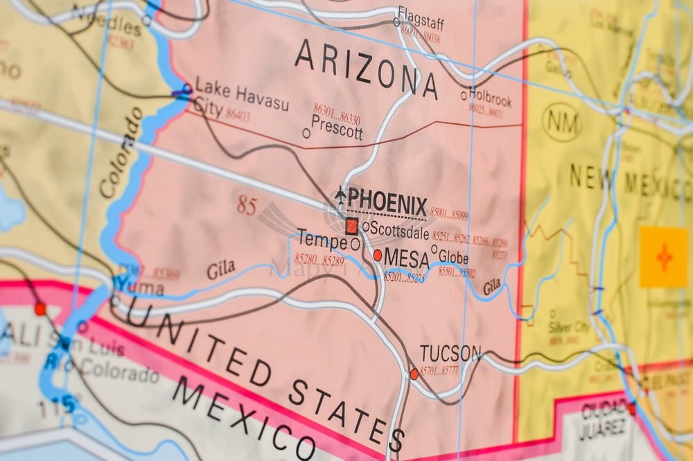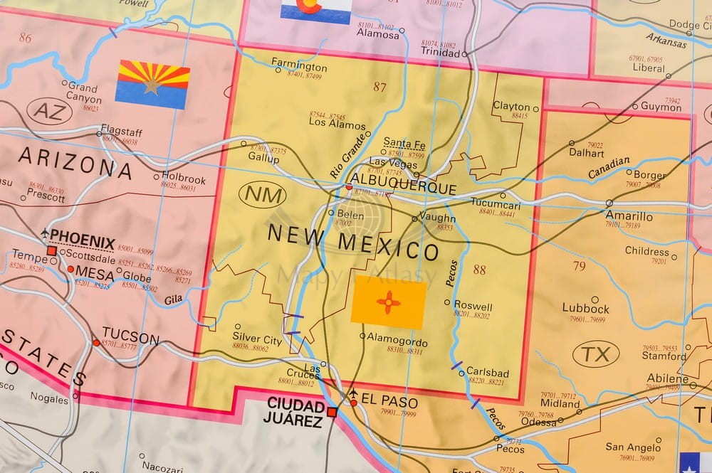 Ścienna mapa Stanów Zjednoczonych z kodami pocztowymi i z siecią dróg. Zaznaczono obszary kodów pocztowych, dodatkowo dla każdego miasta umieszczono na mapie pełny kod pocztowy.