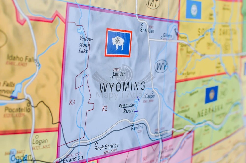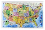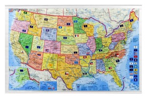Ścienna mapa Stanów Zjednoczonych z kodami pocztowymi i z siecią dróg. Zaznaczono obszary kodów pocztowych, dodatkowo dla każdego miasta umieszczono na mapie pełny kod pocztowy. Widoczne granice wszystkich stanów oraz ich flagi. Flagi dla mniejszych stanów umieszczono na boku mapy, razem z opisem. Cieniowaniem zaznaczono ukształtowanie terenu.