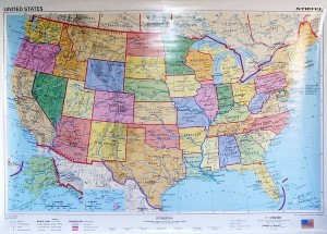 Mapa ścienna dwustronna Stanów Zjednoczonych, administracyjno-drogowa/fizyczna. Odporny laminat strukturalny. Mapa oprawiona w białe wałki drewniane. Górny wałek wyposażony w zawieszkę ze sznurka.