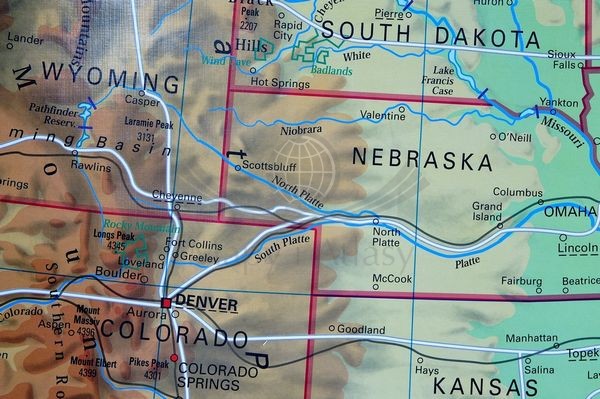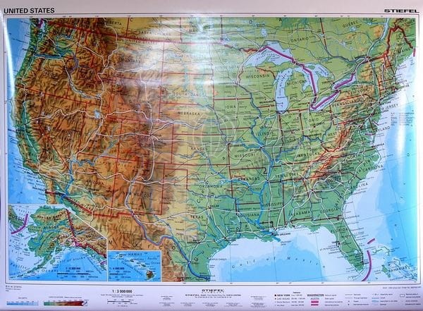 Stany Zjednoczone / USA. Mapa ścienna dwustronna polityczno-fizyczna. Drewniane półwałki. Stiefel