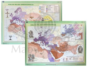 Dwustronna mapa ścienna wydawnictwa Nowa Era przedstawiająca wielkie religie średniowiecza. Na pierwszej stronie przedstawiono mapę zatytułowaną Rozwój wielkich religii świata do XV wieku w skali 1:10 000 000. Na drugiej stronie zamieszczono główną mapę pt. Rozwój chrześcijaństwa i islamu do XV wieku w skali 1:8 000 000.
