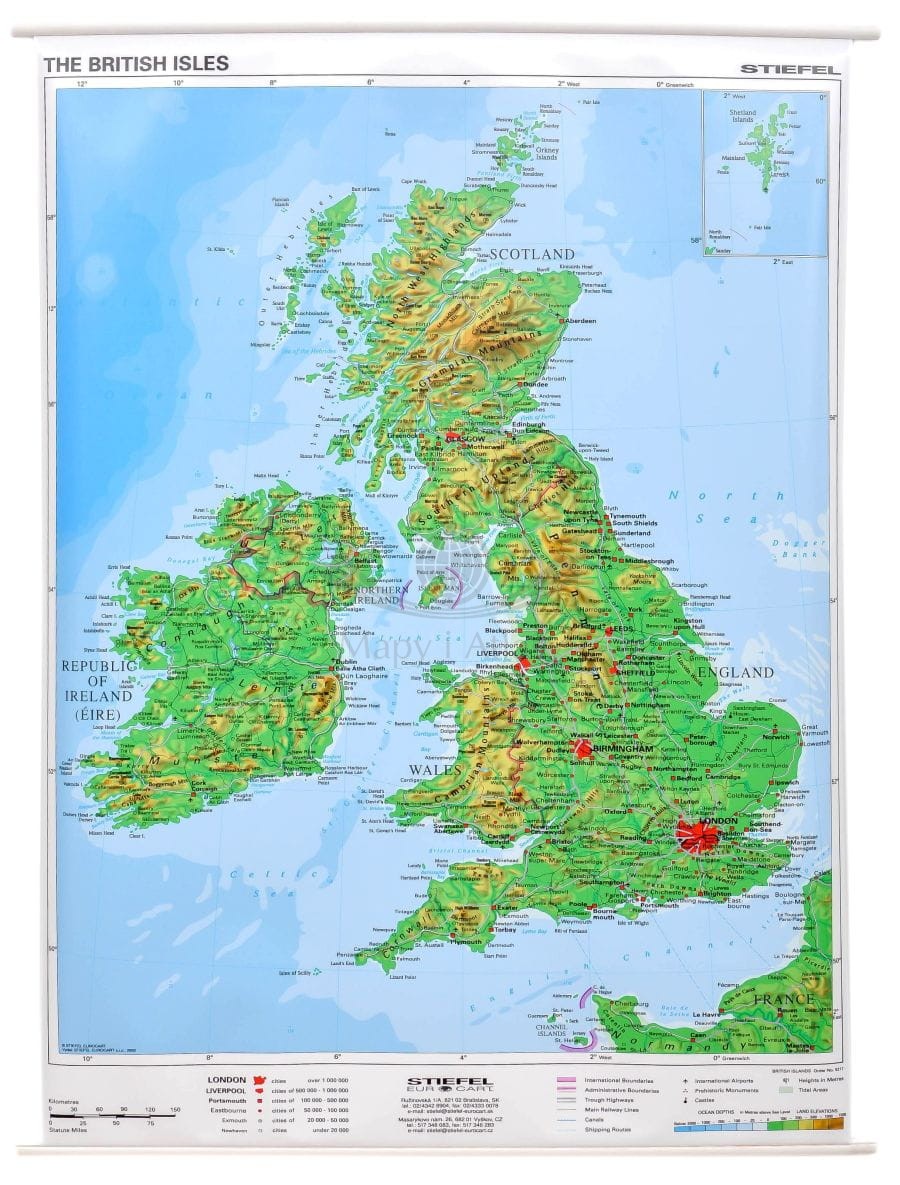 Fizyczna mapa ścienna Wielkiej Brytanii wydawnictwa Stiefel.