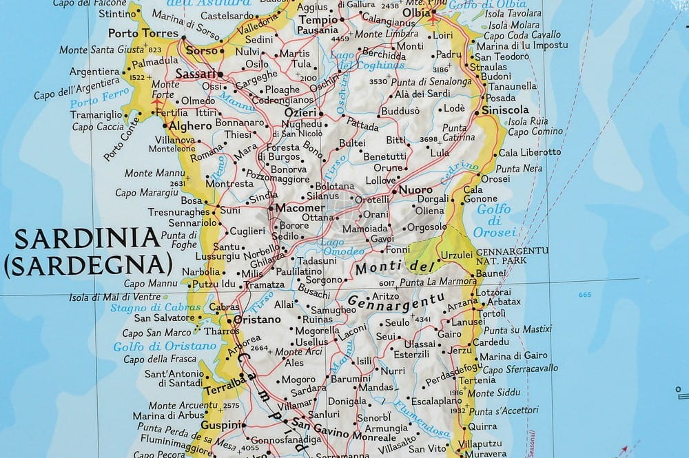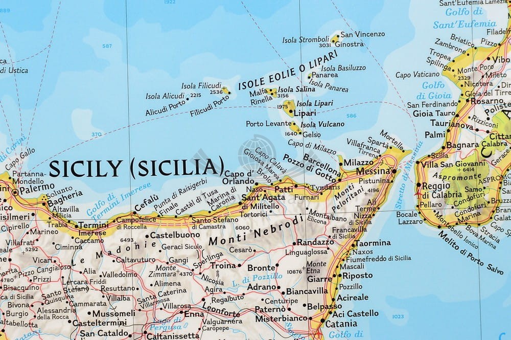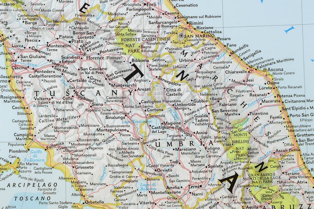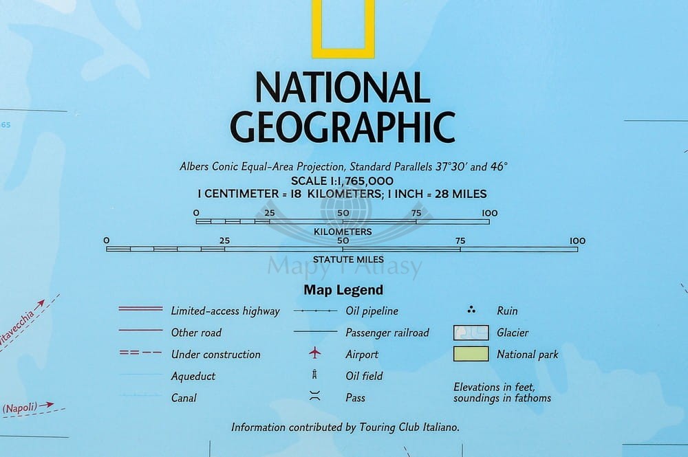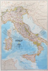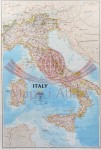 Mapa ścienna Włoch w skali 1:1 765 000 z elementami mapy fizycznej, drogowej i administracyjnej. Stylizacja charakterystyczna dla National Geographic.