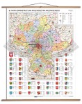 Mapa przedstawia administracyjny podział województwa wraz z uwzględnieniem aktualnej sieci dróg i autostrad oraz kolei. Oprócz trójstopniowego podziału administracyjnego i sieci transportowej, na mapie znajdują się oznaczenia tablic rejestracyjnych.