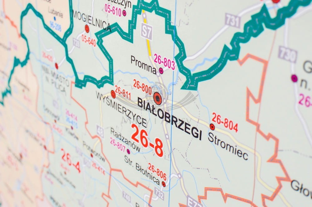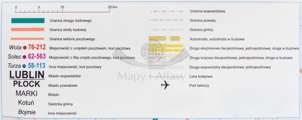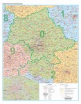 Kodowa mapa ścienna województwa mazowieckiego wydawnictwa Eko-Graf. Na mapie zaznaczono min.: granice okręgów kodowych, granice stref kodowych, miejscowości z urzędem pocztowym, kod pocztowy, miejscowości z filią urzędu pocztowego, kod pocztowy...