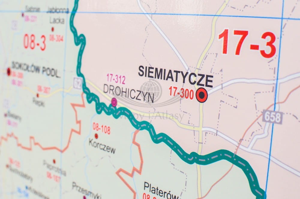 Laminat błyszczący, umożliwiający stosowanie markerów suchościeralnych i wodnych. Mapa oprawiona w rurki, gotowa do powieszenia.