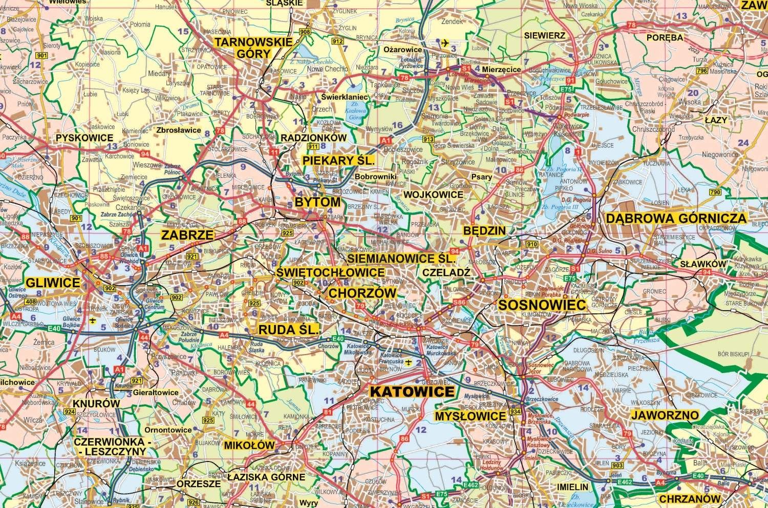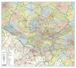 Administracyjno-drogowa mapa ścienna województwa śląskiego i opolskiego w skali 1:150 000. Mapa obejmuje również miasto Wrocław i Kraków.