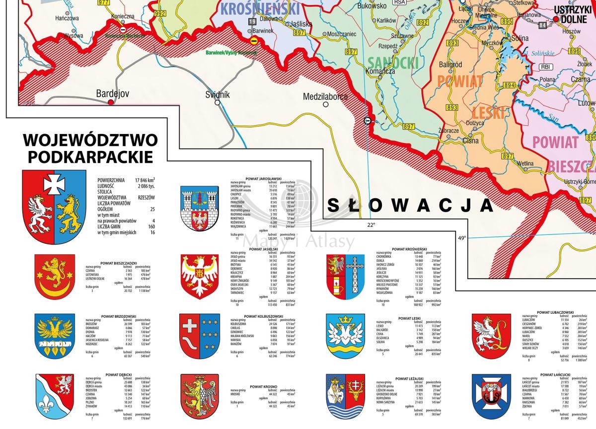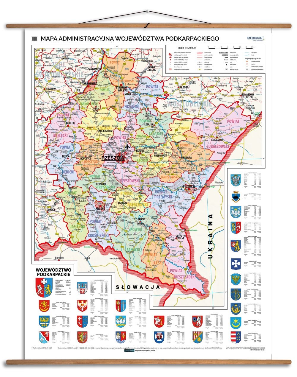 Administracyjna mapa ścienna województwa podkarpackiego w skali 1:170 000 wydawnictwa Meridian.