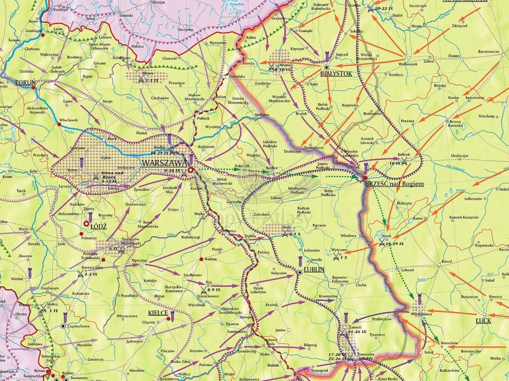 Ukazuje etapy ataku wojsk niemieckich, kierunki natarć, rejony intensywnych walk, miejsca ważniejszych bitew oraz intensywnych nalotów bombowych. Pokazuje także podział Polski między II Rzeszę i ZSRR wg paktu Ribbentrop-Mołotow z 23 VIII 1939 oraz agresję sowiecką od 17 IX 1939.