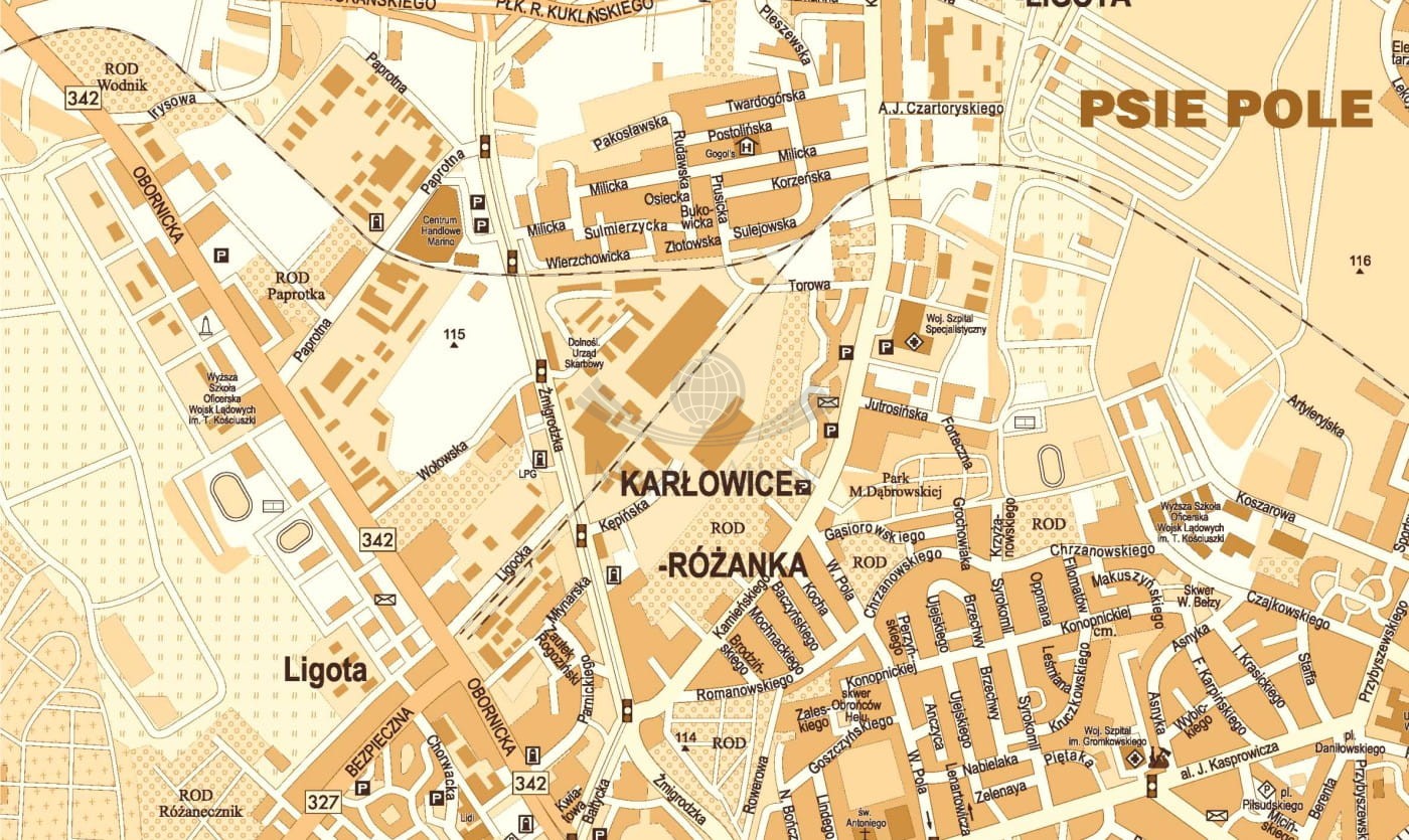 Na mapie zaznaczono m.in.: