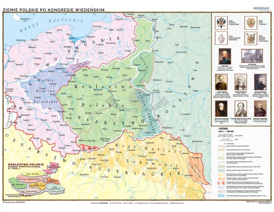 Polska. Ziemie polskie po kongresie wiedeńskim. Mapa ścienna 120 x 90 cm. Drewniane półwałki