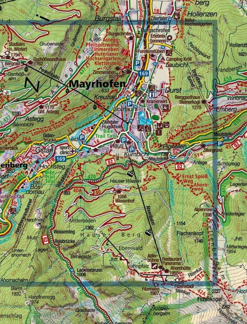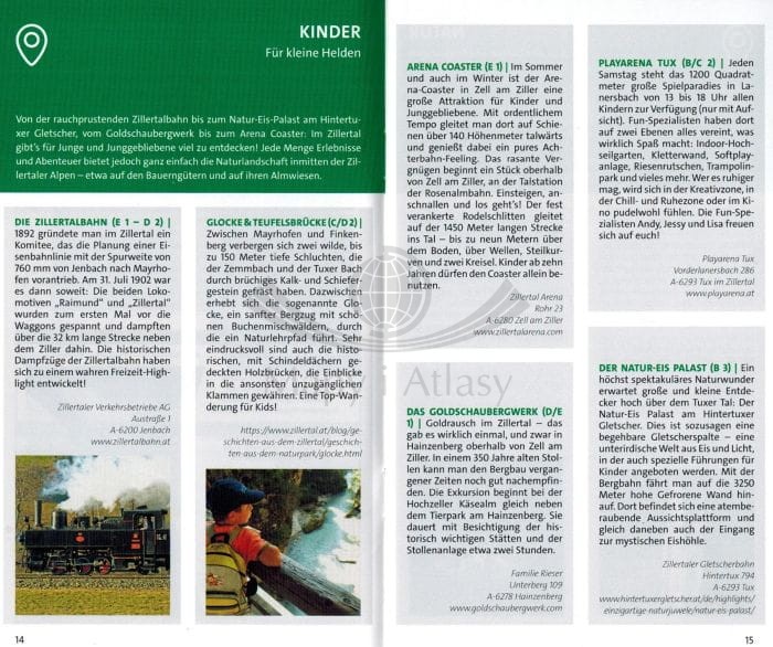 - miejscowości: Mayrhofen, Zell am Ziller, Gerlos, Krimml, Lanersbach, Finkenberg, Hintertux, Ginzling, Prettau, Gde. Ahrntal Com. V. Aurina,