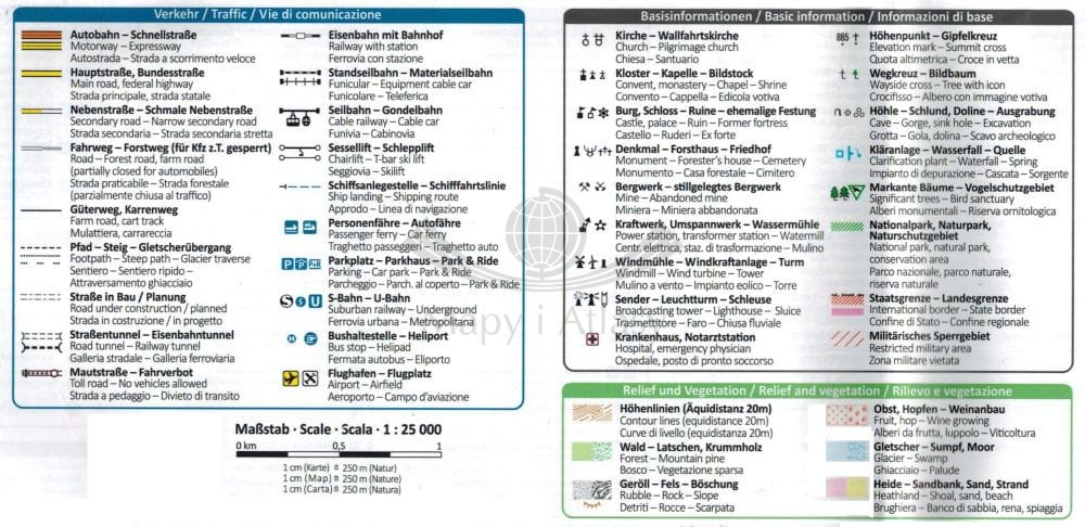 Mapa zgodna z GPS. Legenda w języku angielskim, niemiecki i włoskim.