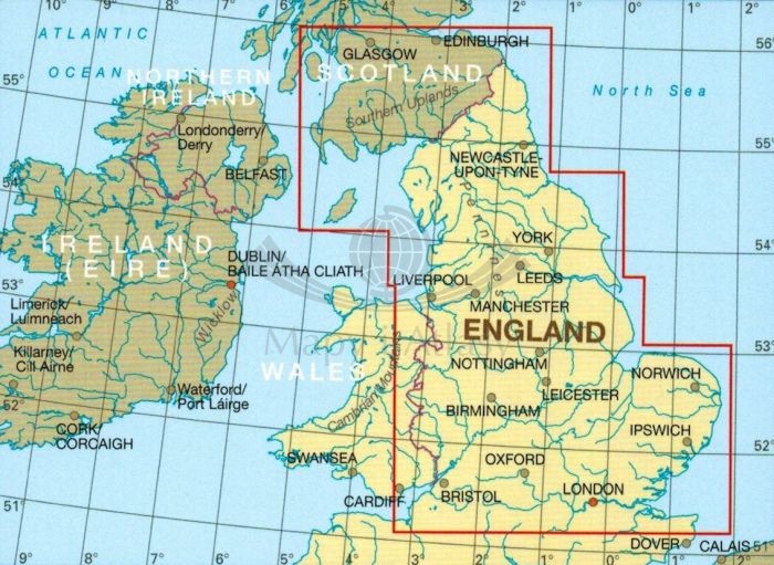 Mapa obejmuje także południową część Szkocji.