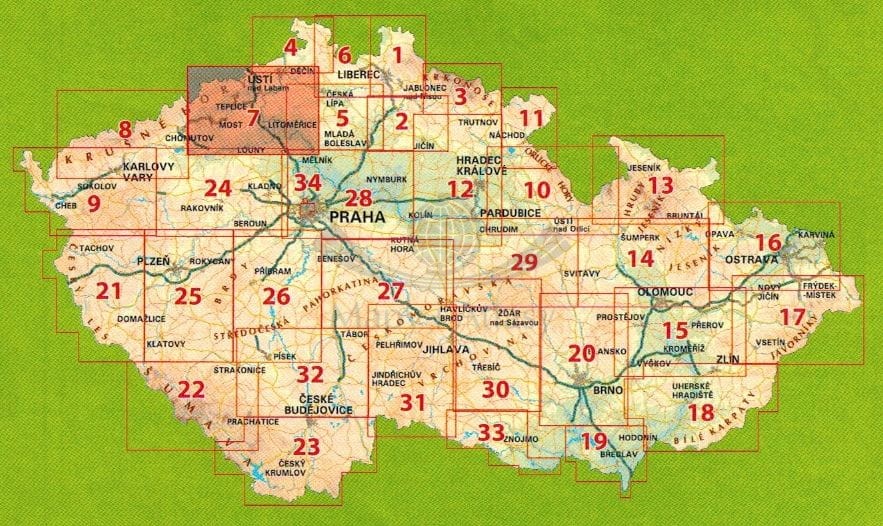 Składana mapa turystyczna Czeskiego Średniogórza i części wschodniej czeskich Rudaw w skali 1:80 000.