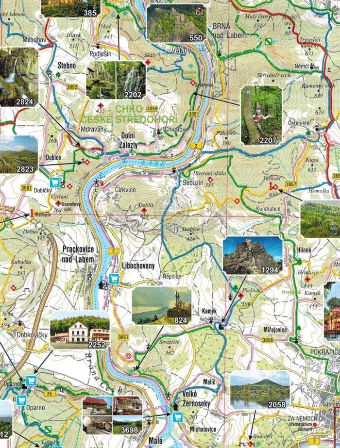 Mapa zawiera dodatkowo plany centrów miast: Děčín, Litoměřice, Žatec.
