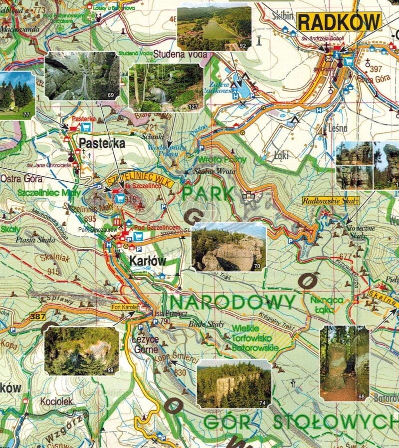 Mapa zawiera dodatkowo plany miast: Wambierzyce, Kudowa-Zdrój, Kłodzko, Duszniki-Zdrój oraz mapę Błędnych Skał i Szczelińca Wielkiego.