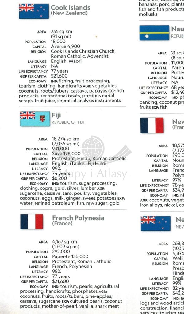 Jedna strona publikacji przedstawia Australię natomiast na odwrocie znajduje się Oceania.
