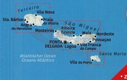 Zestaw dwóch składanych, dwustronnych map turystycznych Wysp Azory w skali 1:50 000 wydawnictwa Kompass.