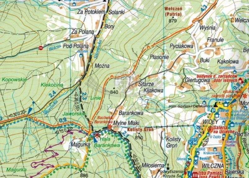 Mapa obejmuje część Beskidu Makowskiego oraz Beskidu Żywieckiego z Babiogórskim Parkiem Narodowym.