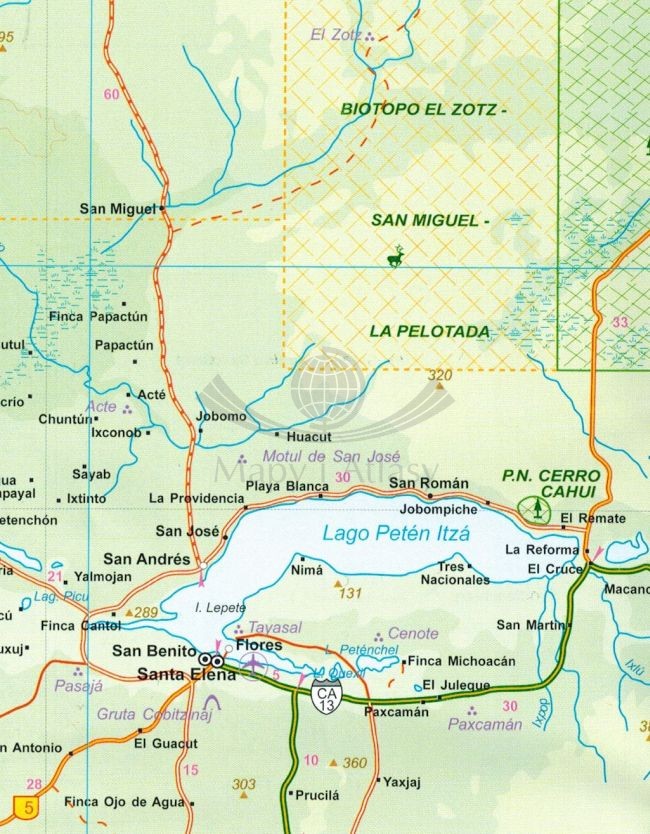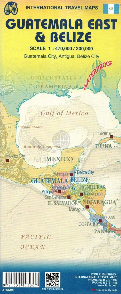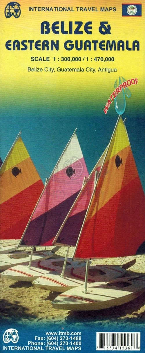Składana, dwustronna, wodoodporna mapa samochodowo-turystyczna Belize w skali 1:300 000 oraz wschodniej Gwatemali w skali 1:470 000 wydawnictwa ITMB.