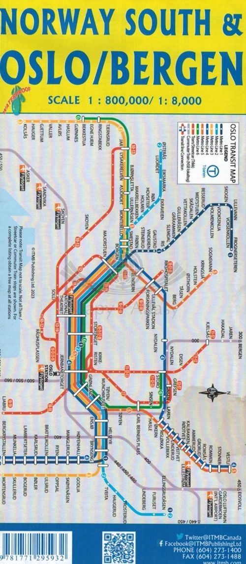 Dwustronny, wodoodporny, składany plan miast Oslo w skali 1:8 000 i Bergen w skali 1:7 400 oraz mapa samochodowa południowej Norwegii w skali 1:800 000 wydawnictwa ITMB.