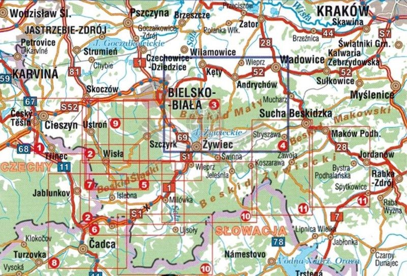 Mapa obejmuje takie miejscowości jak: Andrychów, Kęty, Wadowice, Międzybrodzie Bialskie, Międzybrodzie Żywieckie, Żywiec.