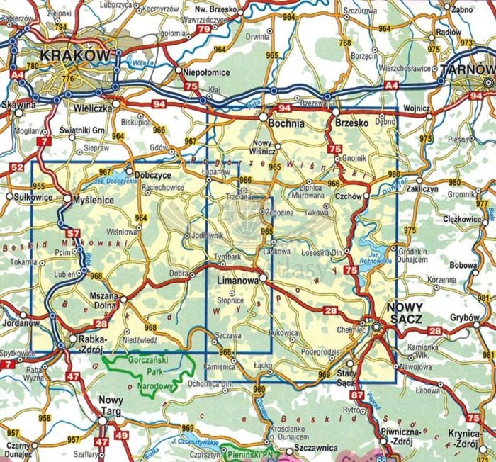 Mapa obejmuje Beskid Wyspowy, Pogórze Wiśnickie oraz wschodnią część Pogórza Wielickiego. Zasięg mapy wyznaczają Brzesko i Dobczyce na północy, Rabka i Stary Sącz na południu, Jordanów na zachodzie oraz Nowy Sącz na wschodzie.