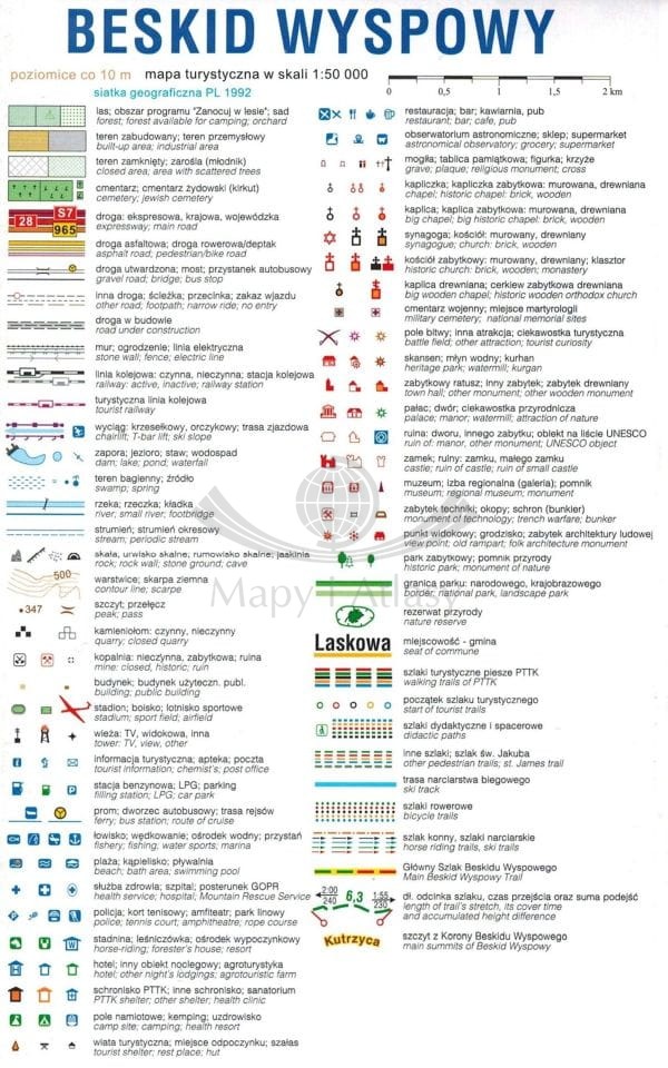 Na mapie zastosowano cieniowanie w celu uzyskania wrażenia plastyczności rzeźby terenu. Mapa zarówno do uprawiania różnych form turystyki, jak również dla osób zmotoryzowanych.
