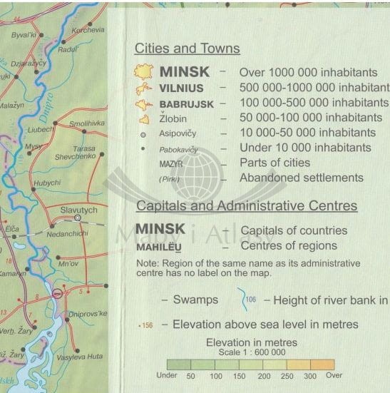 Składana, dwustronna mapa samochodowo-turystyczna Białorusi w skali 1:600 000. Legenda w języku angielskim.