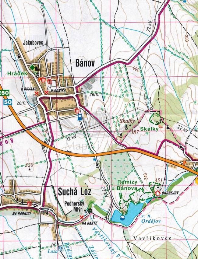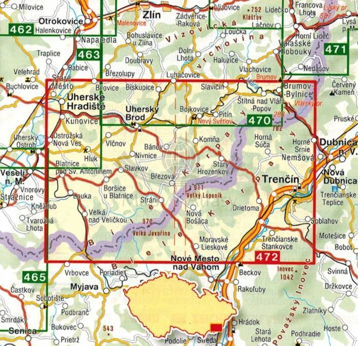 Zasięg mapy to: Uherske Hradiste i Brumov-Bylnice na północy, Trencin na wschodzie, Trencianske Stankovce i Moravske Lieskovce na południu orazOstrozska Nova Ves na zachodzie.