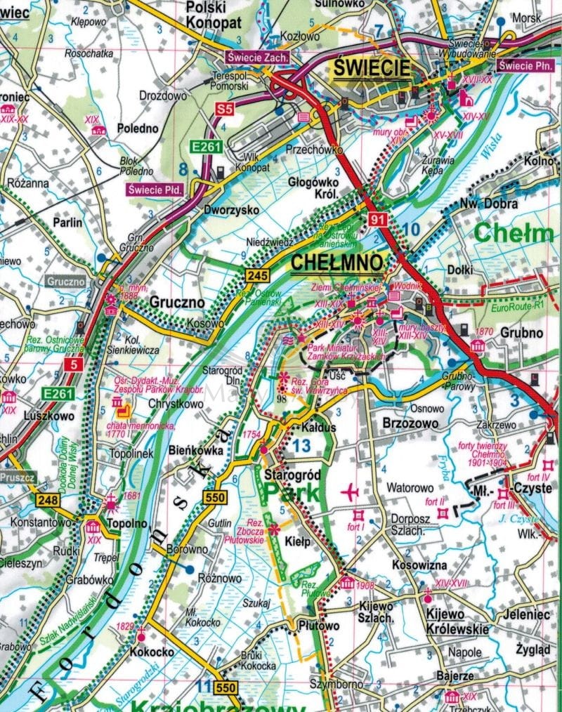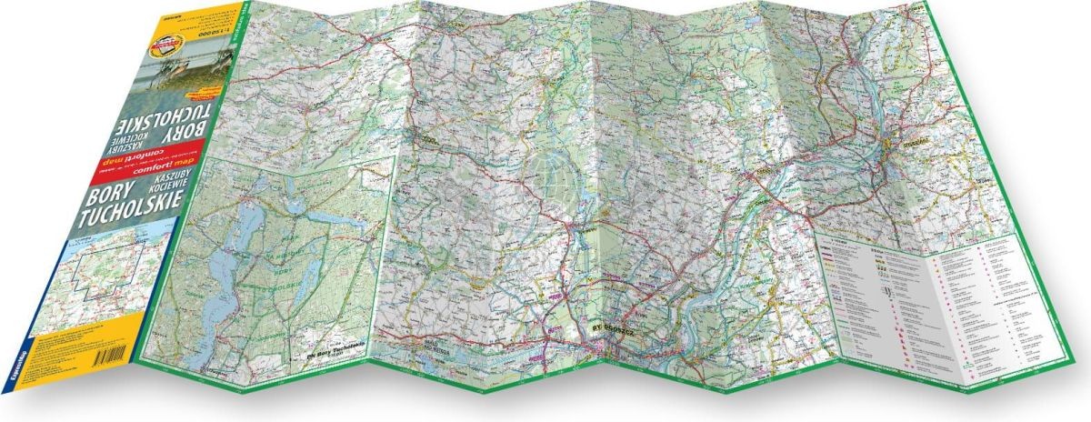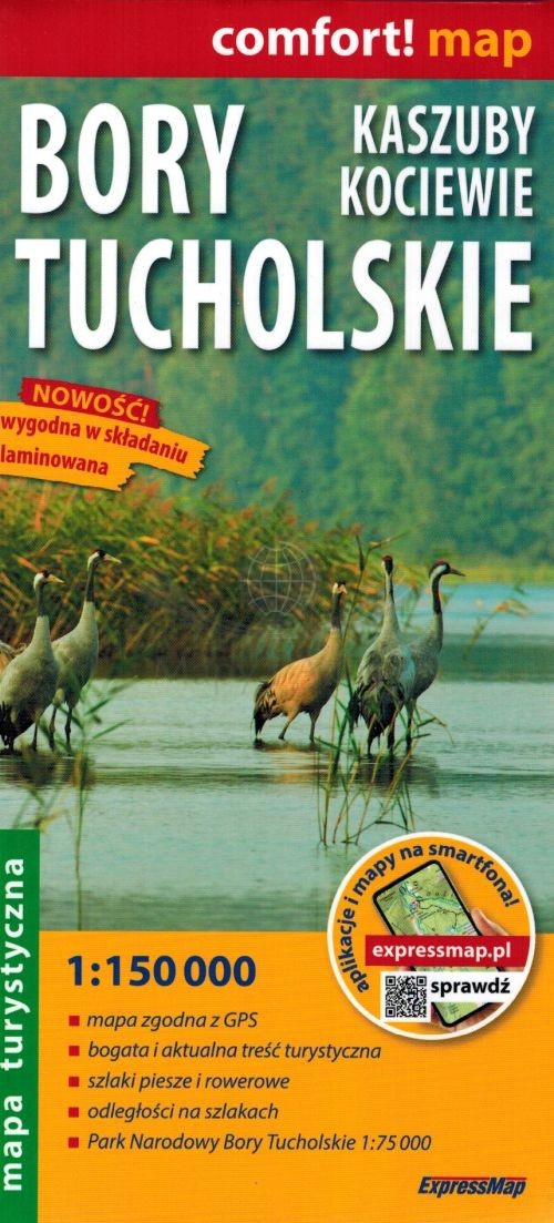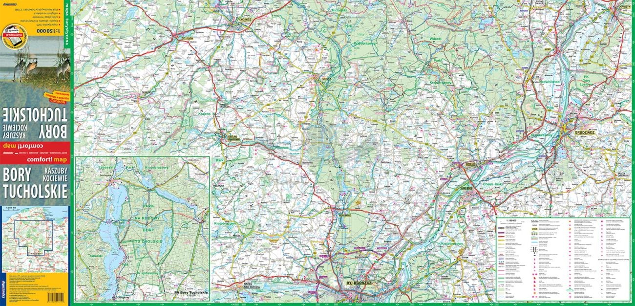 Składana, laminowana, dwustronna mapa turystyczna Borów Tucholskich, Kaszub oraz Kociewia w skali 1:150 000 wydawnictwa ExpressMap.