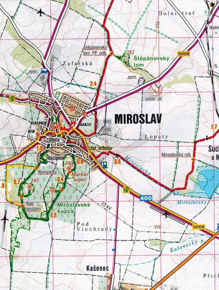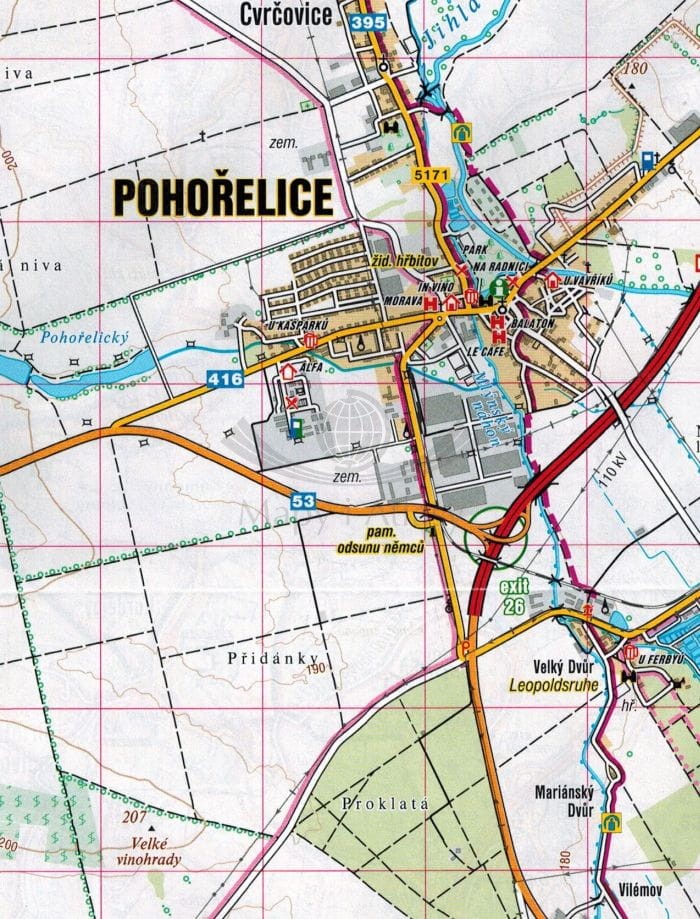 Zasięg mapy to Pohorelice na północy, Brzecław na południowym wschodzie oraz Mackovice i Miroslav na zachodzie.