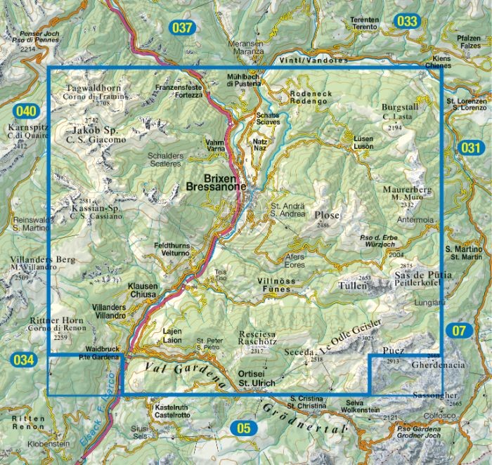 Składana, dwustronna, wodoodporna mapa turystyczna Bressanone oraz Val di Funes w skali 1:25 000 wydawnictwa Tabacco.