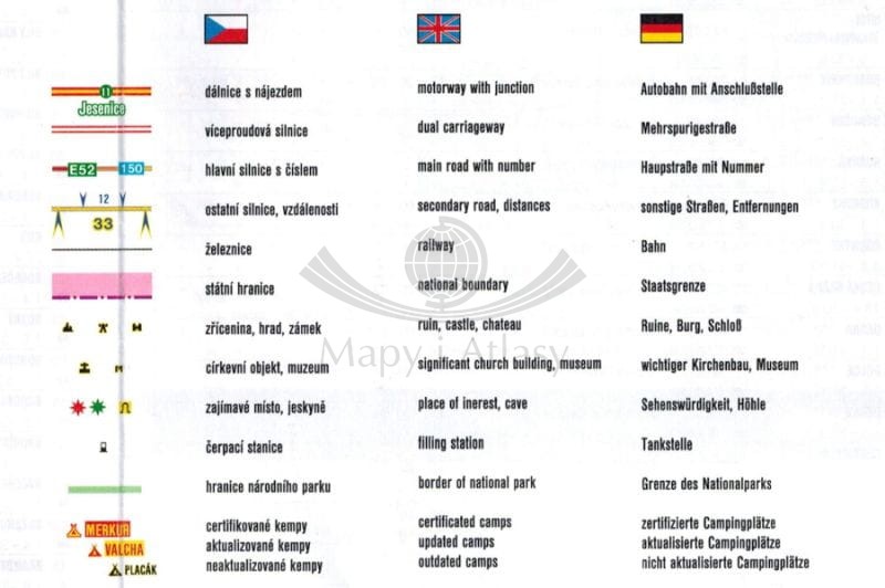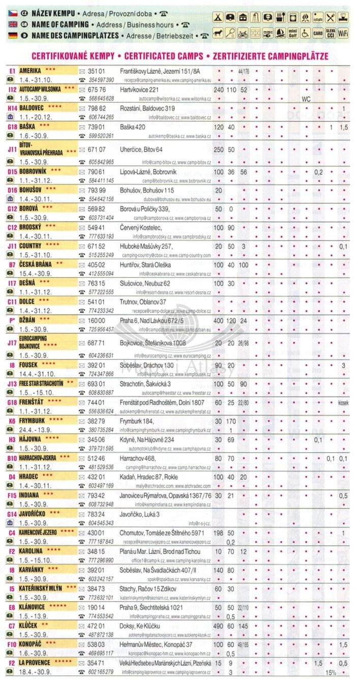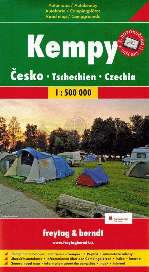 Składana mapa samochodowo-turystyczna campingów w Czechach, w skali 1:500 000. Na mapie zaznaczono m.in.: sieć dróg wraz z numeracją, odległości w kilometrach, ruiny, zamki, pałace, obiekty sakralne, muzea...