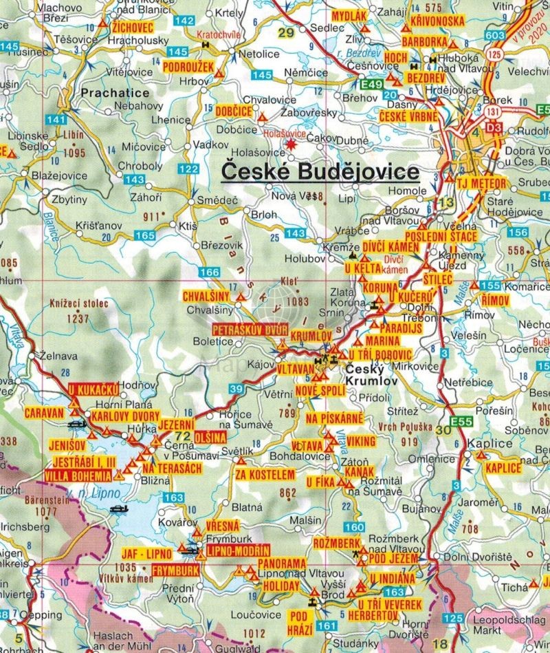 Składana mapa samochodowo-turystyczna campingów w Czechach, w skali 1:500 000.