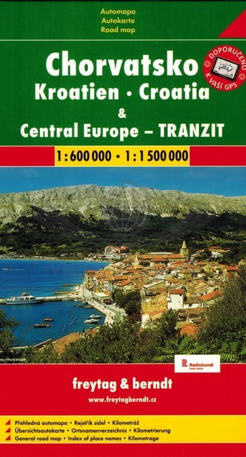 Składana mapa samochodowa Chorwacji w skali 1:600 000 oraz mapa tranzytowa centralnej Europy w skali 1:1 500 000. Legenda w języku: polskim, czeskim, niemieckim, angielskim, francuskim, słowackim, węgierskim oraz rosyjskim...