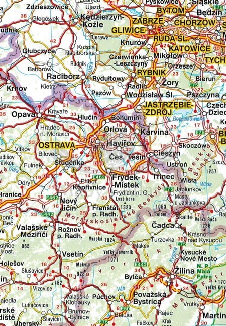 Mapa Europy centralnej obejmuje: południową Polskę, Czechy, Słowację, wschodnią Austrię, Słowenię, Chorwację, Węgry, Bośnię i Hercegowinę oraz północną Serbię.
