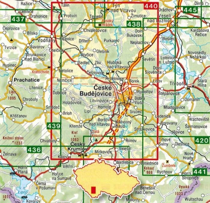 Zasięg mapy to: Tyn nad Vltavou na północy, Neplachov, Lisov i Ledenice na wschodzie, Mirkovice i Czeski Krumlov na południu oraz Chvalsiny, Netolice i Protivin na zachodzie.