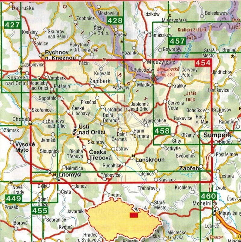 Składana, dwustronna mapa turystyczna Śródgórza Czeskomorawskiego w skali 1:40 000, czeskiego wydawnictwa Shocart. Zasięg mapy to Międzylesie na północy, Zabreh na południowym wschodzie, Litomyśl na południowym zachodzie oraz Sloupnice, Potstejn i Doudleby nad Orlici na zachodzie.