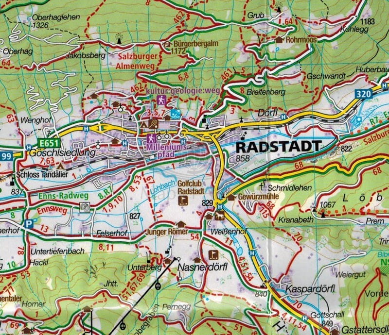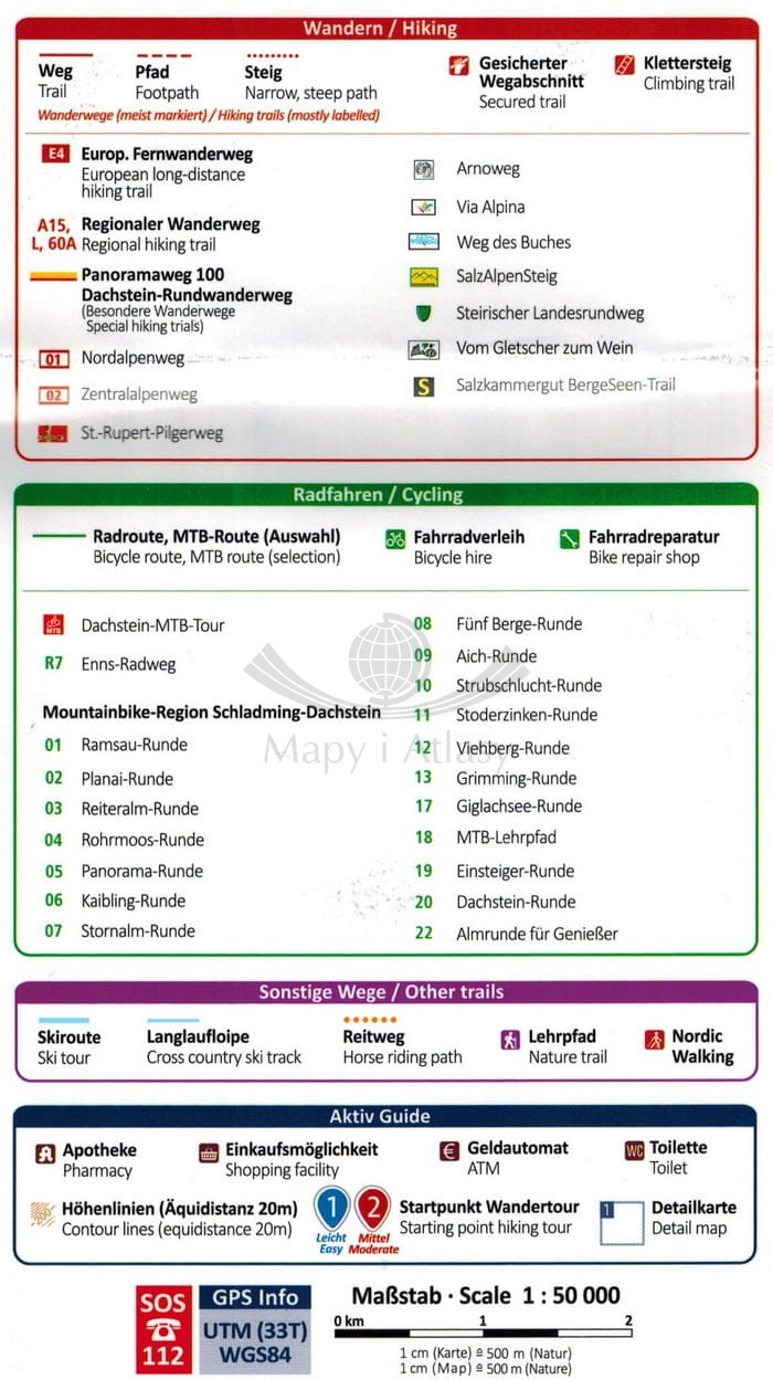 Składana, jednostronna, wodoodporna mapa turystyczna okolic Radstadt, Schladming oraz Flachau w skali 1:50 000 wydawnictwa Kompass.